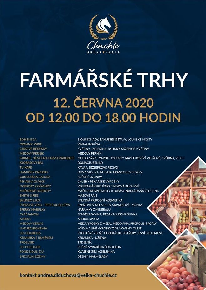 Nově se v areálu Chuchle Arena Praha budou konat Farmářské trhy - pilotní díl proběhne jako paralelní akce k prvním parkurovým závodům a jejich součástí bude i otevřená pikniková zóna s poníky, ZOO koutkem a jinými atrakcemi pro děti. Velké parkoviště k dispozici.