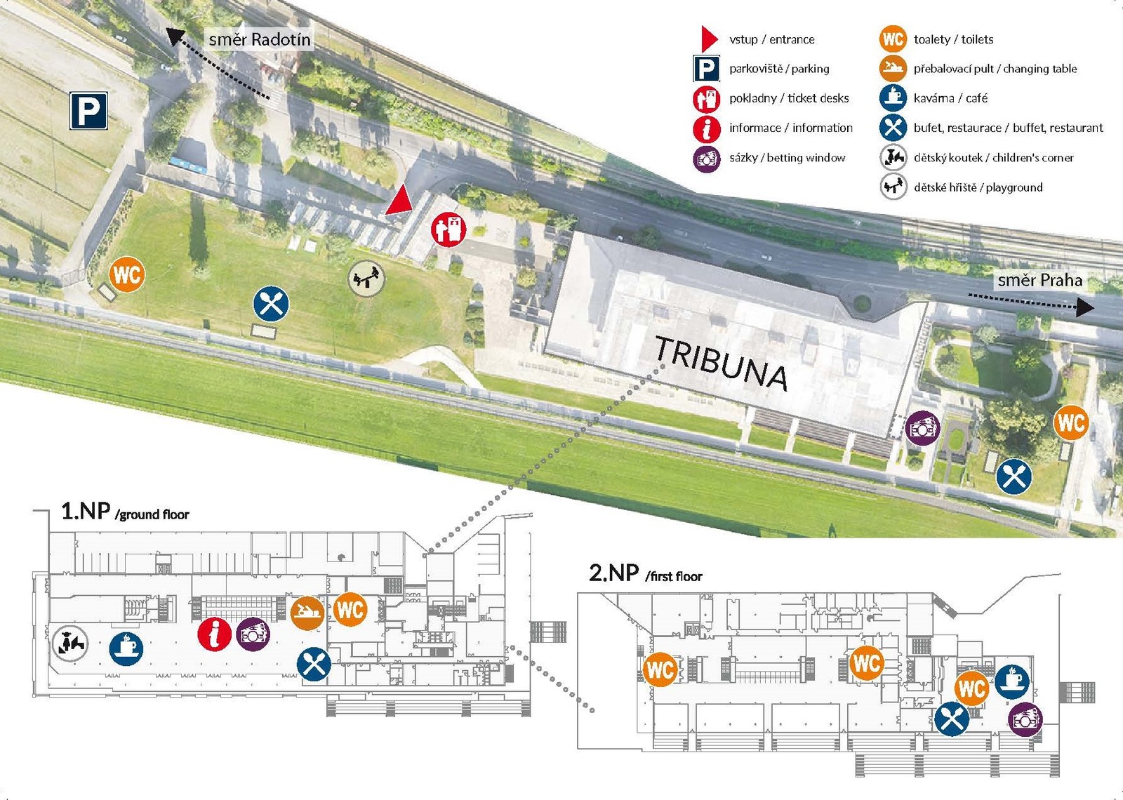 Gastro: restaurace, kavárna, food trucky, stánky rychlého občerstvení. Hlediště tribuny je kryté proti nepřízni počasí.
